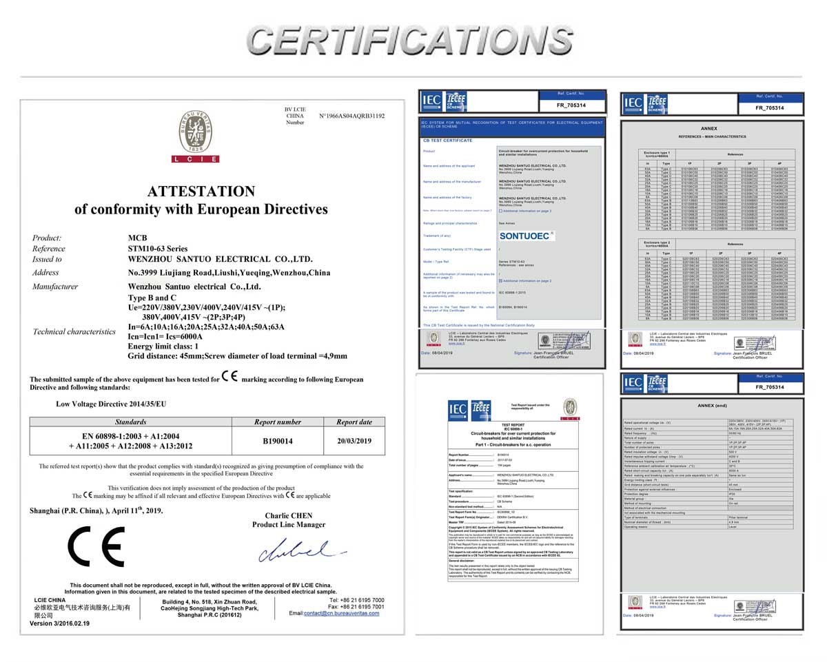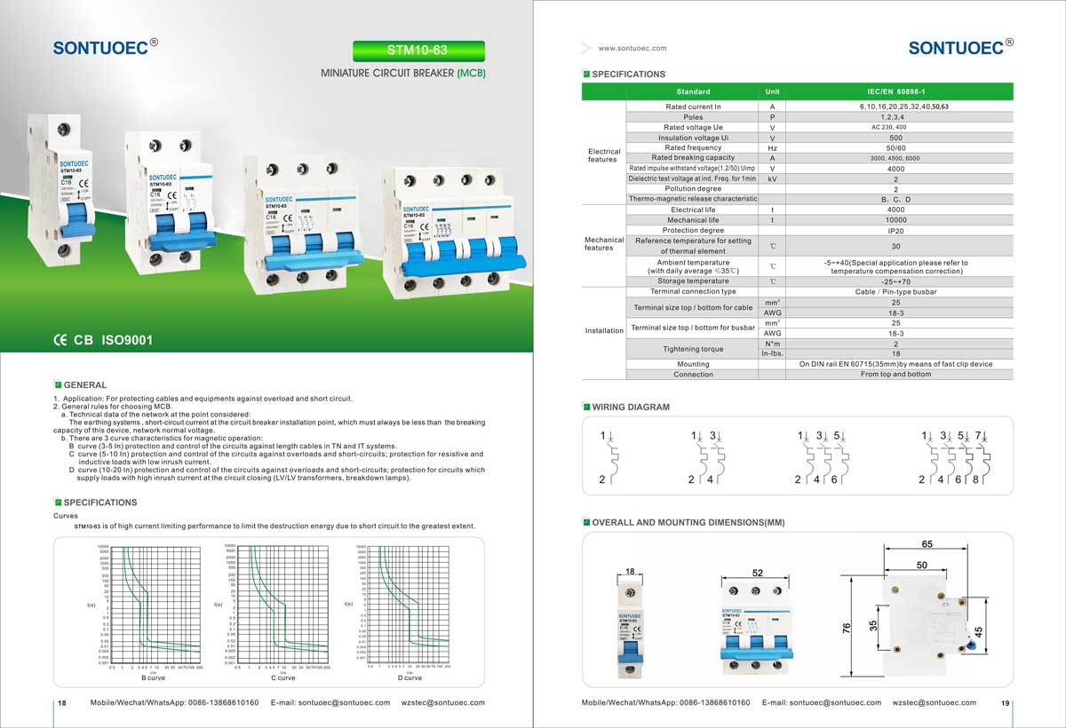 SONTUOEC הוא אחד מהספקים/יצרנים הסיניים המתמחים בייצור של מכשירי חשמל קטנים שונים STM10-63 מפסק מיניאטורי בעל תכונות של מבנה מתקדם, ביצועים אמינים, כושר שבירה גבוה, מראה אלגנטי והמעטפת והחלקים שלו עשויים מחומר עם עמידות בפני פגיעה, תכונה חזקה של מעכב בעירה. זה מתאים למערכת של 50 או 60 תדר, Ue 400V ומטה, Ui 63A ומטה. זה תואם את התקנים IEC60898.1 ו-GB10963.1
